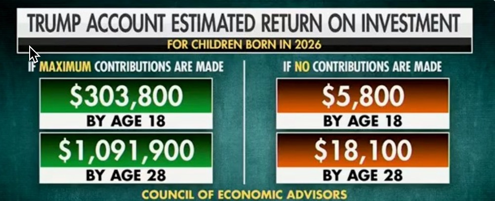 - Starting in 2026, new parents will have $1,000 deposited in an investment account. The value of a “Trump Account” in 18 years will range from about $5,800 (no extra deposits) to potentially over $300,000 with maximum annual deposits. Is that positive?